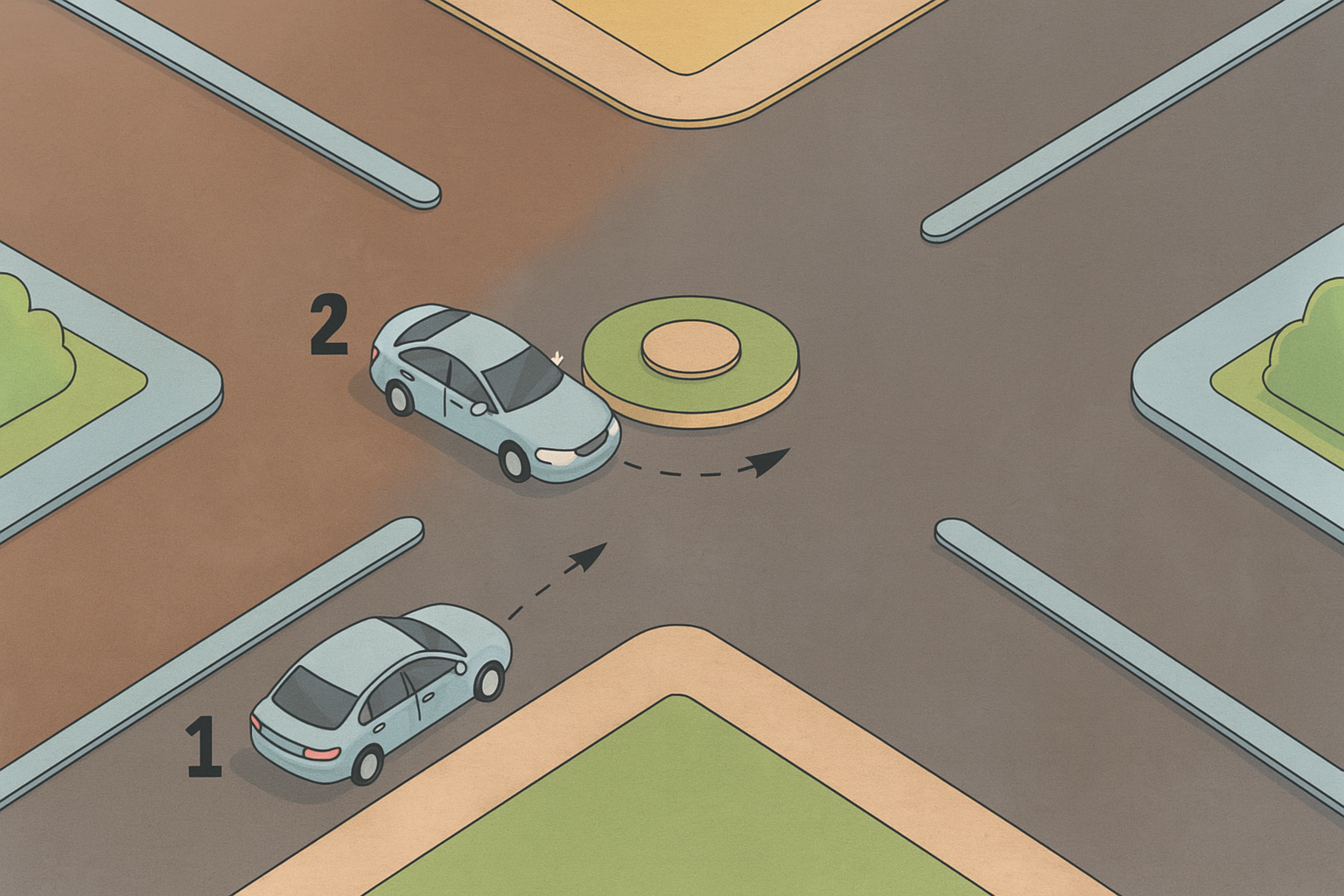 Şekildeki gibi bir döner kavşakta, henüz kavşağa girmemiş olan 1 numaralı araç sürücüsü ne yapmalıdır?
